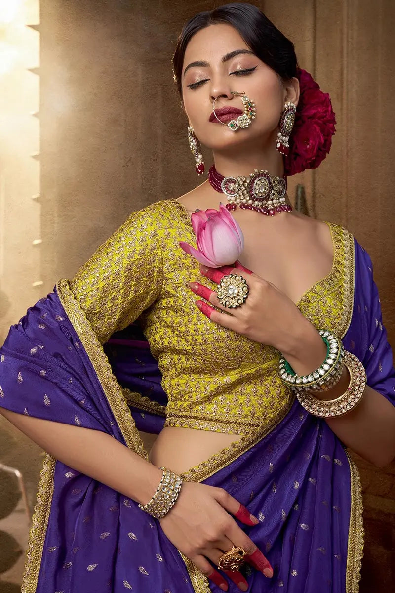 Violet Handwoven Banarasi Saree with Lemon Embroidered Blouse