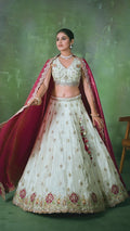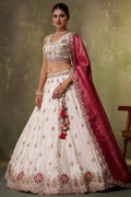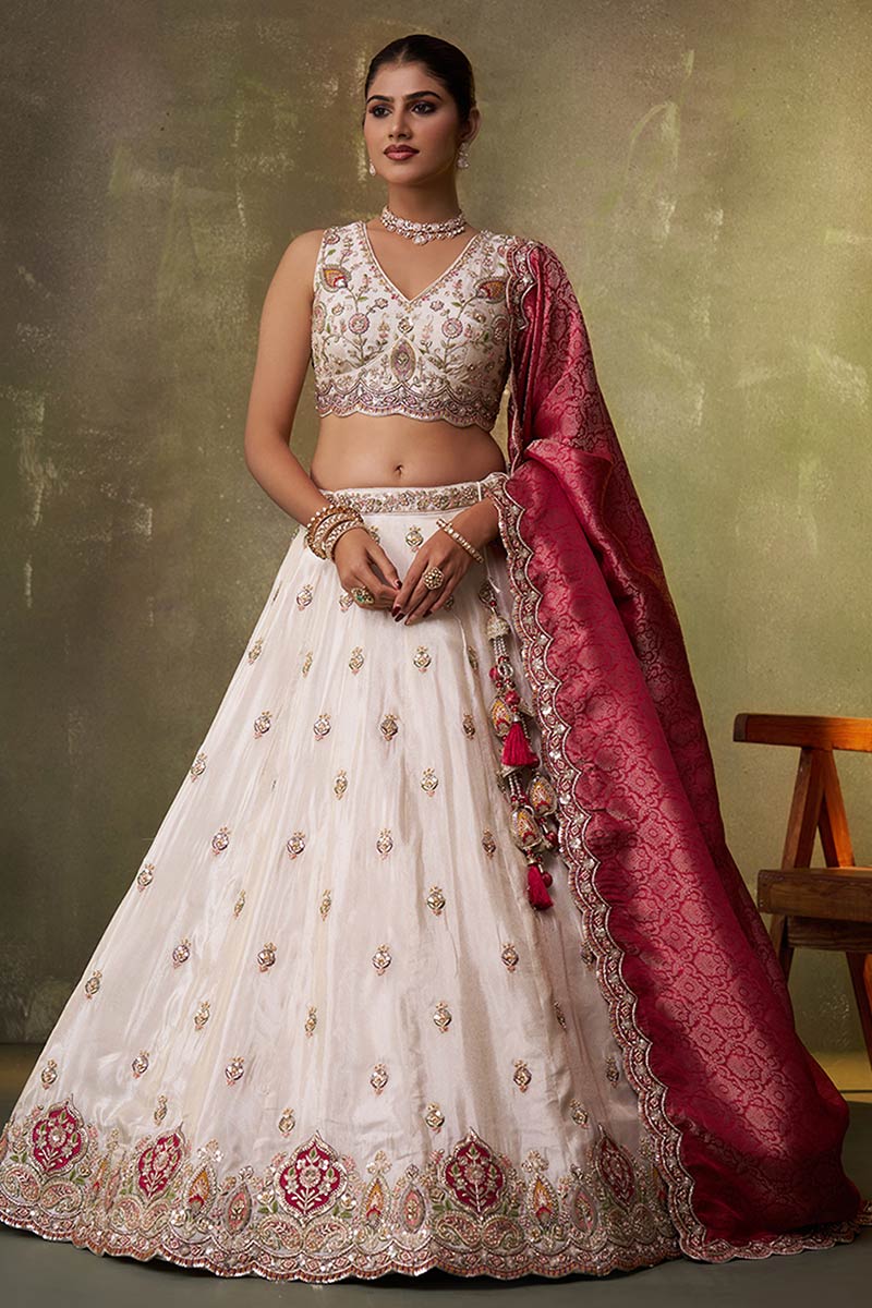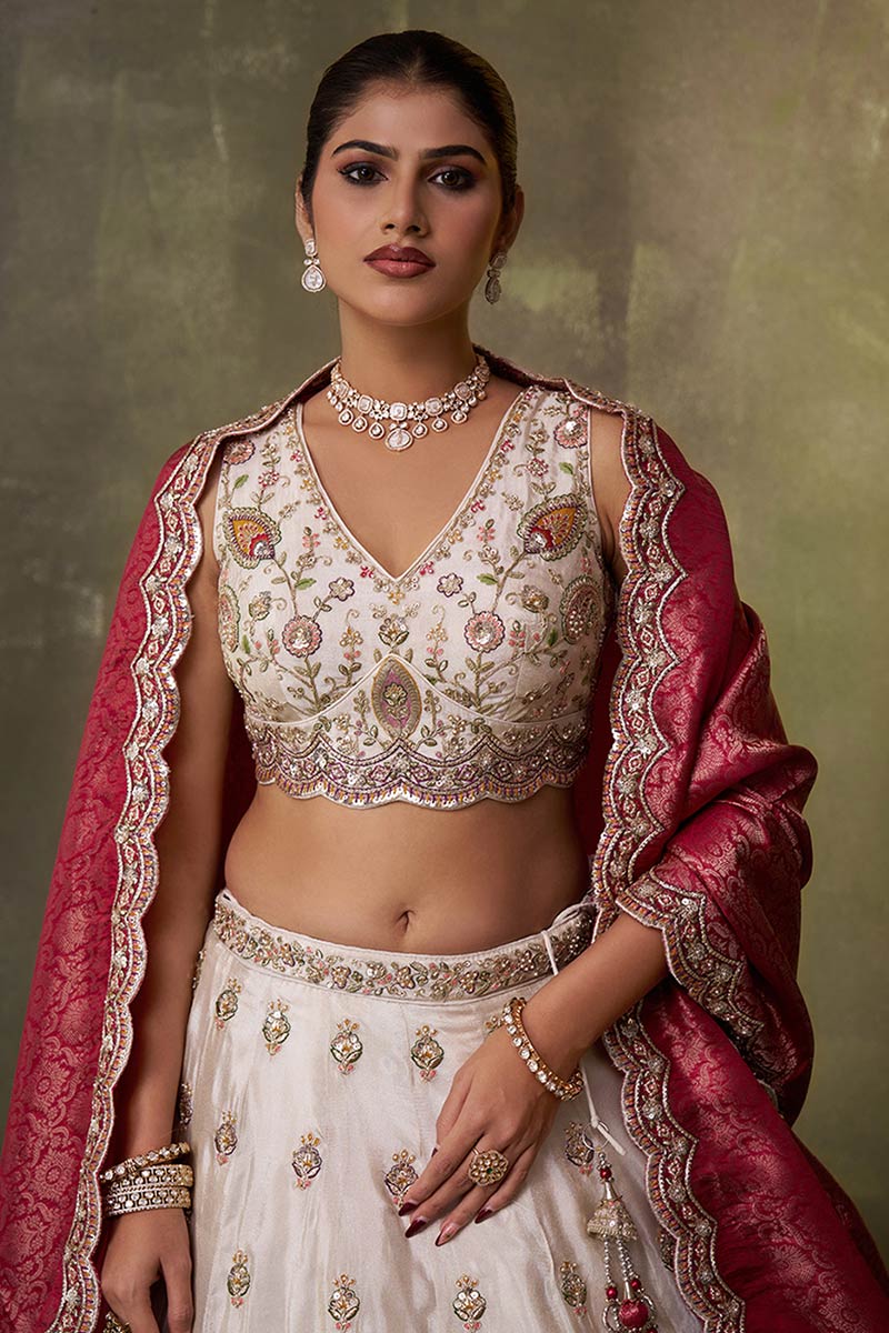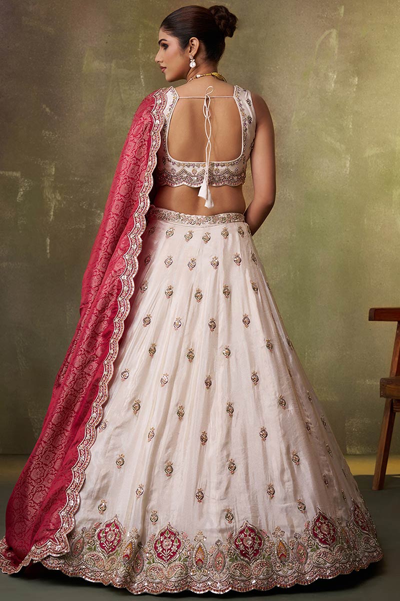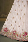 Elevate your ethnic wardrobe with this enchanting Pink and ivory embroidered lehenga choli set, featuring delicate floral threadwork and sparkling accents. Designed for brides, wedding guests, and festive celebrations, this outfit pairs a beautifully detailed skirt with a matching embroidered blouse and graceful dupatta.