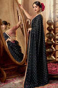Step into regal elegance with this stunning Black Banarasi saree, adorned with delicate golden motifs and finished with a finely detailed zari border. Paired with a Rani Pink embroidered blouse, this ensemble is a celebration of traditional craftsmanship and timeless grace.