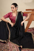 Elevate your wardrobe with this timeless Black georgette saree, adorned with a delicate gold embroidered border. Crafted for grace and flair, this saree combines fluid draping with festive detailing. Perfect for weddings, festive gatherings, or formal evening events. Lightweight and elegant, it pairs beautifully with a complementary blouse for a curated look.