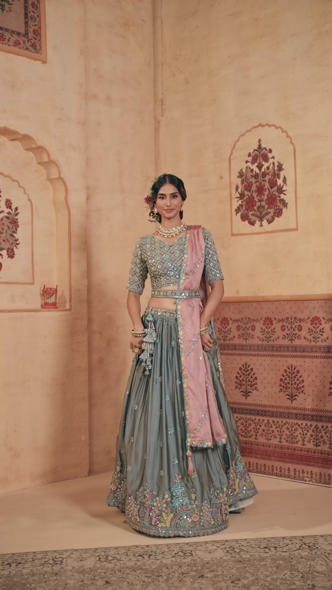 Step into elegance with this stunning Charcoal Grey Lehenga Choli featuring intricate mirror work and vibrant thread embroidery. Crafted from premium-quality net with a graceful fall, this semi-stitched lehenga is adorned with delicate floral detailing and paired with a contrasting blush pink dupatta—adding a soft, feminine flair to the bold ensemble.