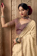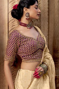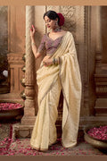 Step into regal elegance with this stunning Cream Banarasi saree, adorned with delicate golden motifs and finished with a finely detailed zari border. Paired with a Purple embroidered blouse, this ensemble is a celebration of traditional craftsmanship and timeless grace.