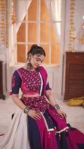 Add a burst of festive flair with this stunning, twirl-worthy lehenga set. The richly embroidered ghagra features vibrant teal and gold florals on a Multi Colour base, accented with an opulent gold border for unmatched elegance. Paired with a matching choli and a mirror-worked dupatta, this ensemble is perfect for celebrations, Garba nights, or wedding festivities. With its lightweight fabric, it flows beautifully—designed to bring color, joy, and movement to every special occasion.