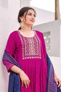 A stunning Pink Anarkali Type Gown with Dupatta dress featuring intricate gold-tone embroidery across the bodice, sleeves, and hem. Crafted from flowy fabric with a flattering silhouette that flares gracefully. Long sleeves and a coordinating dupatta included enhance its elegance—perfect for festive events, weddings, or evening wear.