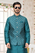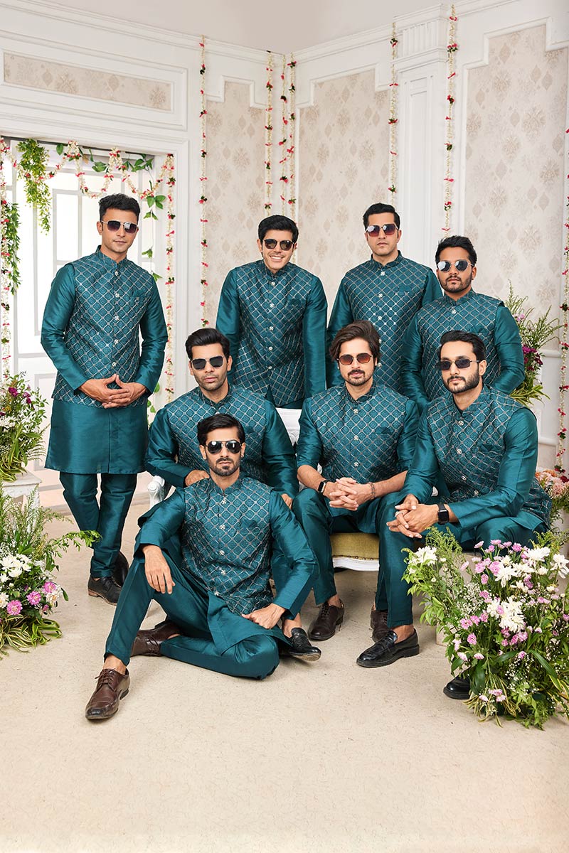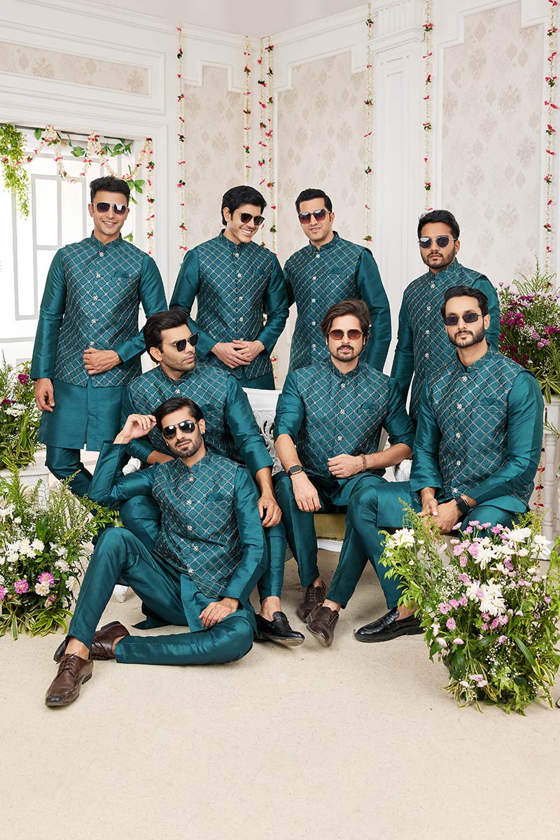 Make a refined statement at weddings and festive celebrations with this men’s Green kurta pajama set, paired with a stylish printed Nehru jacket and matching turban. Designed for elegance and comfort, this outfit blends traditional Indian craftsmanship with a modern silhouette—perfect for grooms, groomsmen, or wedding guests.