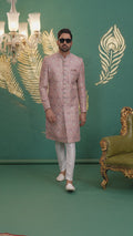 Elevate your traditional wardrobe with this exquisitely designed Onion sherwani, perfect for weddings, festive occasions, or formal celebrations. Crafted from premium fabric, this piece features intricate thread embroidery in paisley and geometric patterns, detailed button closure, and a classic mandarin collar. Paired with a Off White churidar and matching mojaris, this ensemble delivers timeless elegance and unmatched sophistication.
