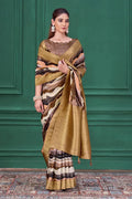 Turn heads at every occasion with this exquisite multicolor designer saree. Adorned with artistic wave patterns and a lavish gold zari border, this saree blends modern elegance with timeless tradition. The earthy tones and silky drape make it ideal for festive events, weddings, and cultural celebrations.