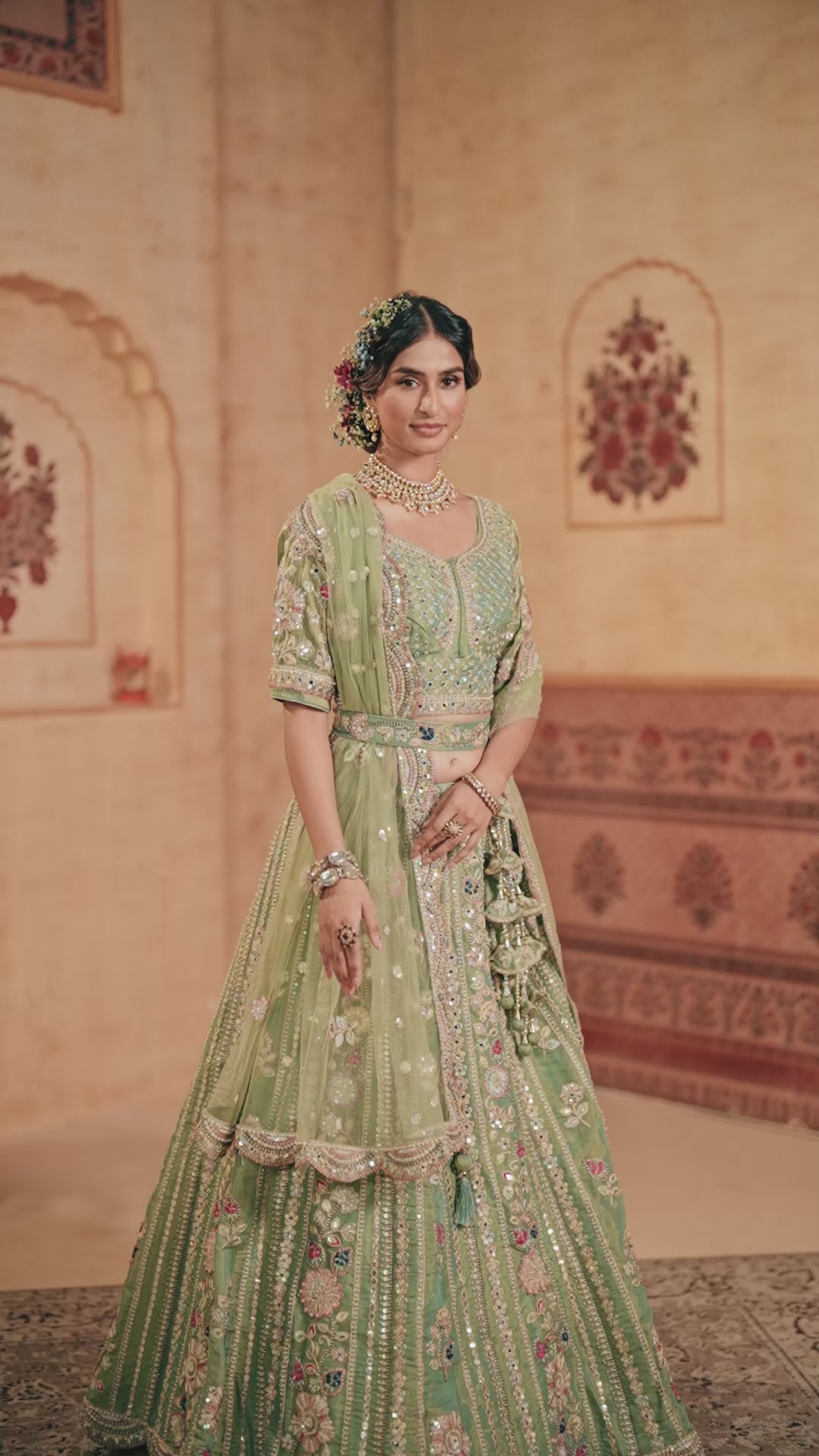 Turn heads with timeless elegance in this Pastel Green Embroidered Lehenga Choli, a celebration of traditional craftsmanship and modern sophistication. Designed in premium net fabric, this lehenga features intricate zari, sequin, and thread embroidery throughout, adorned with vibrant floral motifs and delicate scalloped edges. The semi-stitched lehenga is paired with a heavily embroidered choli and matching dupatta, perfect for weddings, festive occasions, or a statement bridesmaid look.