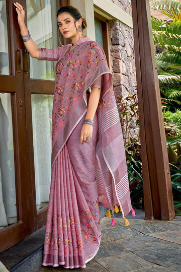 Purple Embroidered Linen Cotton Saree with Floral Motifs