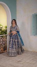Step into timeless elegance with this royal Teal blue lehenga, crafted from luxurious net fabric and adorned with intricate golden zari and sequin embroidery. This masterpiece features a heavily embroidered flared skirt, matching blouse with sheer embroidered sleeves, and a net dupatta detailed with stone and zari work. Perfect for weddings, receptions, or festive occasions, this ensemble brings a regal touch to every celebration.